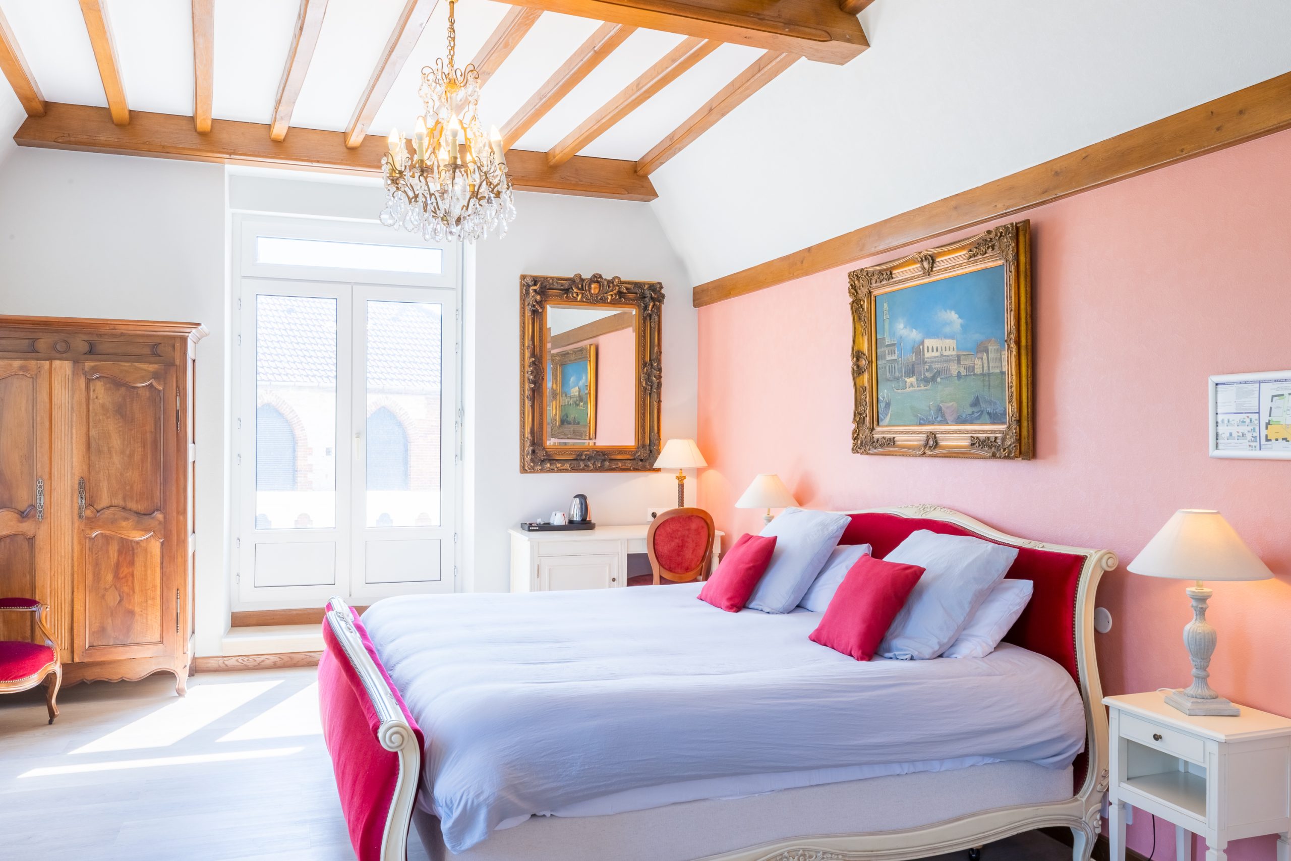Au sein de notre château, profitez de notre suite romantique disposant d’un lit King Size, d’une baignoire balnéo et de la vue sur le parc.